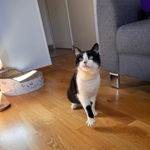 Elle aime beaucoup la présence humaine : elle nous suit partout et miaule pour attirer l’attention… jusqu’à ce qu’on la caresse, et là, apaisement total.